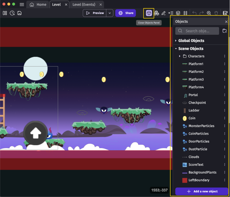 The Scene Editor is where you can design and build the game levels, menus, inventories, or any other screen in the game. The Scene Editor allows you to create and add objects to the scene. The gameplay and rules of the game can be created using events in the Events Editor.